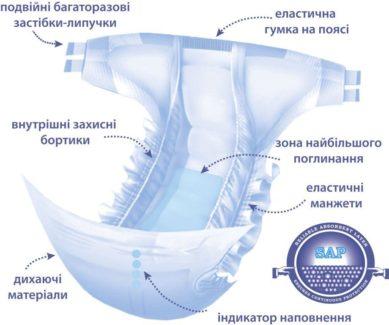 * Середній шар, подвійний всмоктуючий шар з оптимальною кількістю суперабсорбенту (SAP), який нейтралізує запах і рівномірно розподілений по всій всмоктуючої поверхні подушечки. Абсорбент перетворює рідину на гель, сприяє її утриманню усередині підгузника.